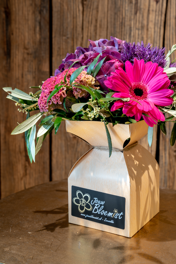 Een compact gebonden boeket in een watertas. Ideaal… zo kan de ontvanger meteen van de bloemen genieten!